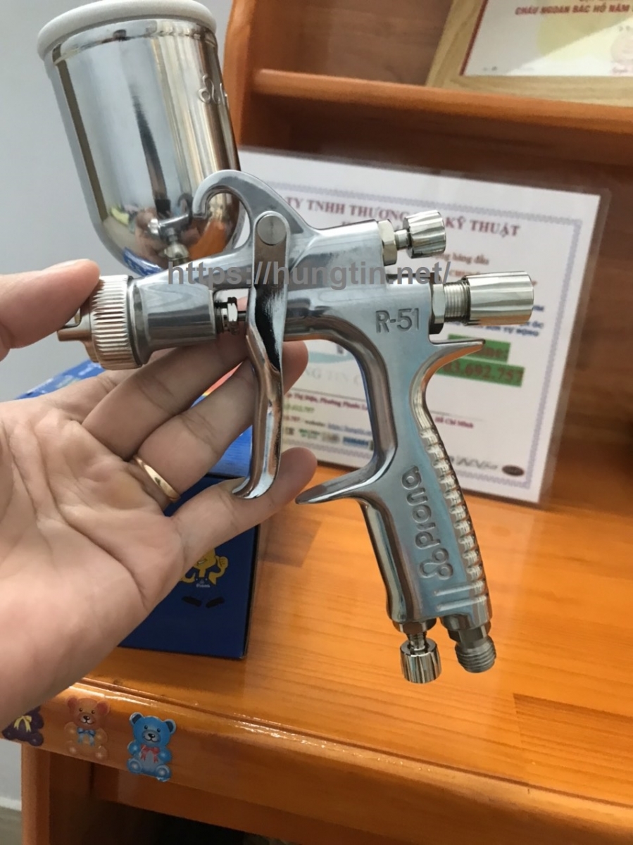 - Súng phun sơn Prona R51-F béc 0.5mm dùng nhiều để phun sơn cho ngành đồ gỗ, phun sơn nội thất, phun sơn xe máy, phun sơn xe ô tô, phun sơn lên kính, phun thực phẩm, phun khuôn, phun ván sàn, phun sơn bao bì, phun sơn ngành nhựa,...