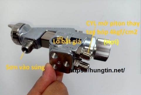 Súng phun tự động, hoạt động trên áp suất khí nén. Nguyên lý là khí đi vào qua đường CAP có nhiều vụ xé tơi sơn, đường CYL có nhiệm vụ rút kim để sơn phun ra (súng cầm tay thì mình sẽ bóp cò). Súng có thể lắp đặt trên giá hoặc lắp đặt trên cánh tay robot trong dây chuyền sản xuất.