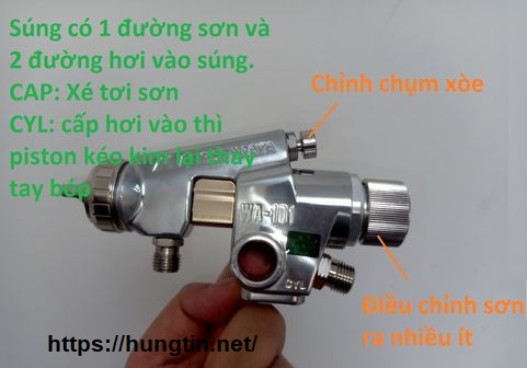 Với hình ảnh trên thì hiện nay súng đang có một đường hơi và một đường sơn vào súng y như súng cầm tay. Đường CAP viết tắt của Air cap set để xé sơn ra như súng cầm tay.