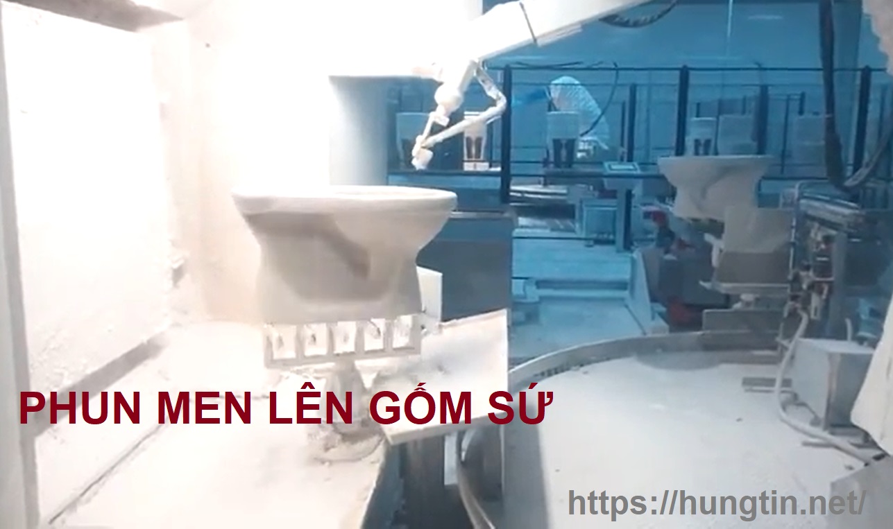 Bồn rửa mặt, bồn cầu, bát đĩa, gạch men đều được phun men tự động. So với phun sơn thì men có độ đậm đặc cao hơn. Thêm vào đó là hạt men có tính chất bào mòn nhanh. Do đó kim béc chuẩn cho ngành gốm sứ cần phải chọn súng chuyên dụng kim béc bằng vonfram các bon để chống lại ăn mòn. Nếu dùng súng thông thường thì rất nhanh bị mài mòn hỏng kim béc.